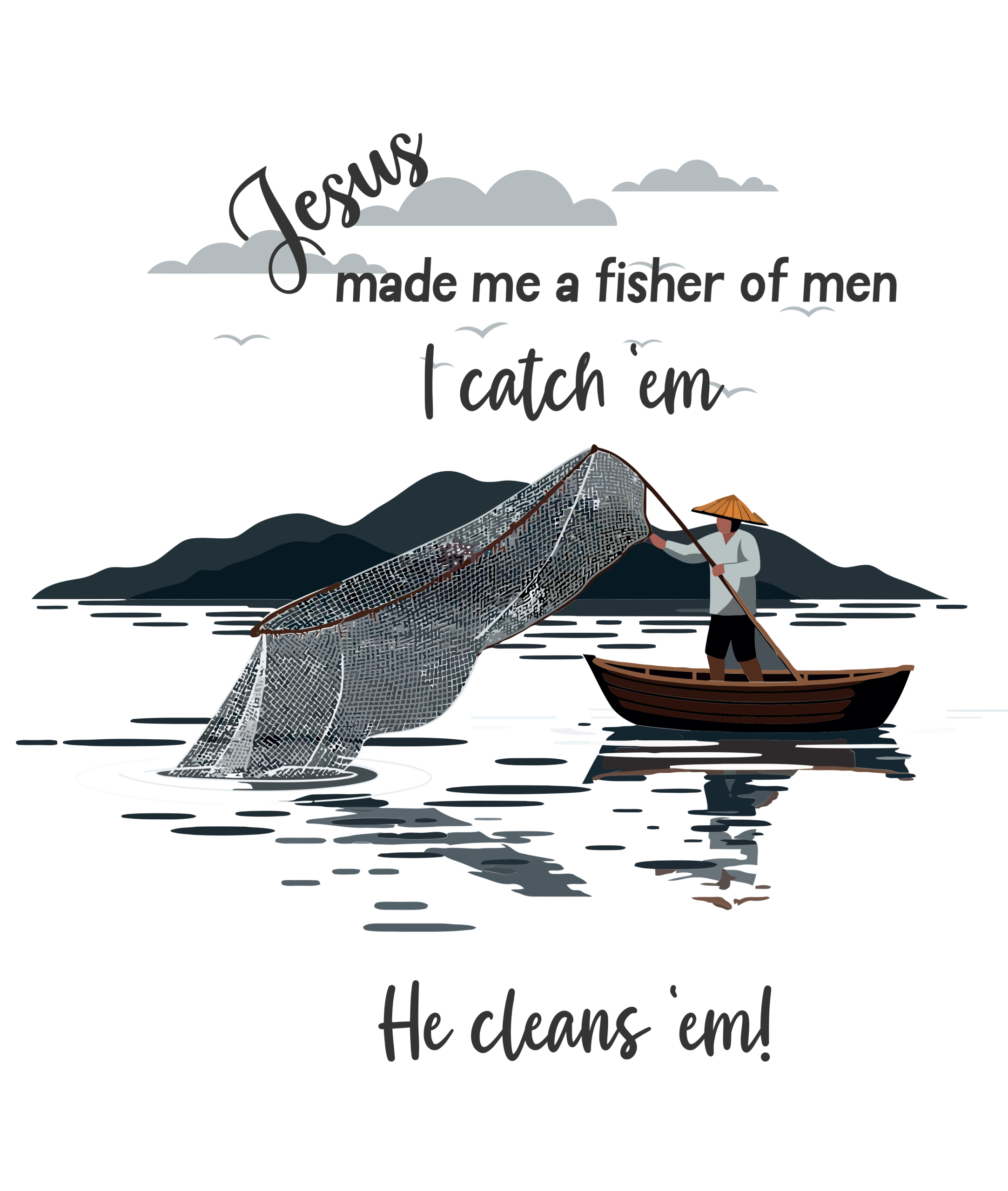 Christian message to share…Are you a “fisher of men?” White shirt will be 100% polyester and colors more vibrant. Pastel colors are a 65/35 blend of polyester/cotton and colors will not be as vibrant.